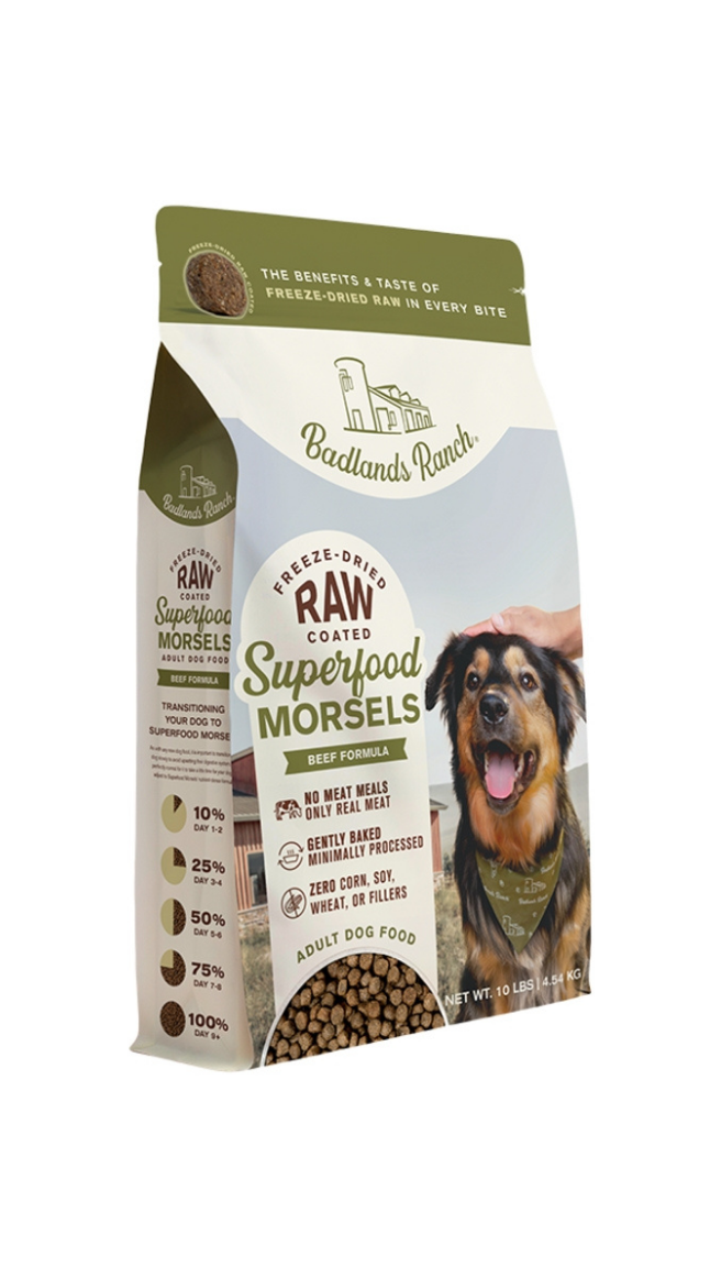 Treat your furry friend to the ultimate meal with Badlands Ranch Superfood Complete Raw Coated Morsels Beef Dry Dog Food. Each morsel is gently baked for a satisfying crunch and then coated in a nutrient-rich, freeze-dried raw superfood blend. This coating is super tasty and freeze-dried to lock in nutrients and flavor. This recipe is the perfect combination of wholesome baked nutrition and the powerful benefits of raw food, delivering maximum flavor, texture, and nutritional benefits in every bite. Plus, these morsels are free from corn, soy, wheat, and fillers. They contain no meat, fish, or poultry meals, and feature just real, quality ingredients you can trust.