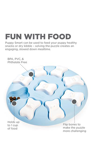The Nina Ottosson by Outward Hound Puppy Smart interactive dog puzzle is a fun way to get your dog excited about problem solving games! This level 1 dog puzzle toy features nine treat hiding compartments that can be filled with your pup’s favorite treats and covered with nine dog bones that release the tasty scent of treats through the top hole. Place on the ground and watch your dog use his noggin as he paws, and nudges the bones over to uncover the hidden rewards! You can also vary the level of difficulty by placing the bones flat or tilting them up at an angle over the hidden compartments.